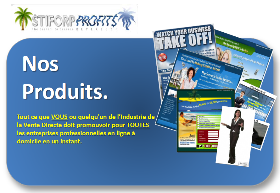 Plusieurs outils de marketing internet comme des films de présentation interactive en flash, des vidéos présentateurs pour des sites internet, des bannières publicitaires, des pages de capture de prospects, des auto-répondeurs, des contact manager, des rotateurs de trafic et bien d’autres encore. Ce sont des outils génériques qui peuvent être utilisés pour promouvoir l’affaire Stiforp et/ou n’importe quelle autre affaire en dehors de Stiforp (c’est prévu pour des affaires à domicile).
